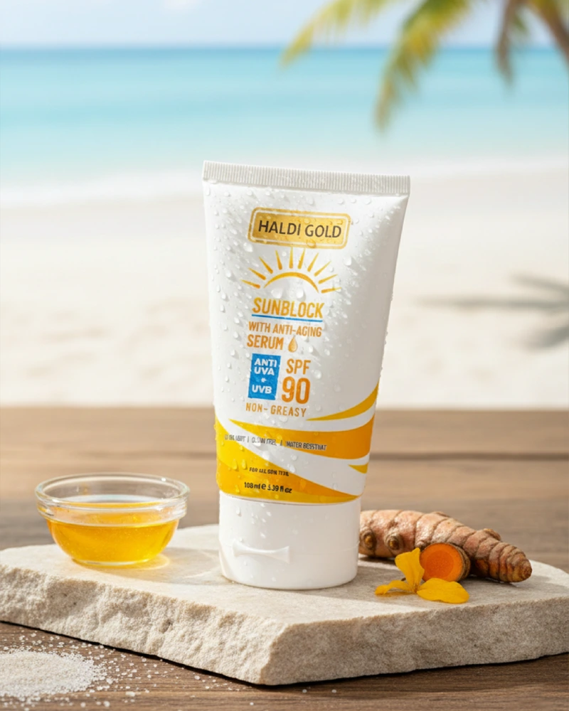 Haldi Gold Sunblock SPF 90 with Anti-Aging Serum provides powerful sun protection while helping prevent signs of aging. Its lightweight, non-greasy formula keeps skin safe, smooth, and comfortable all day.